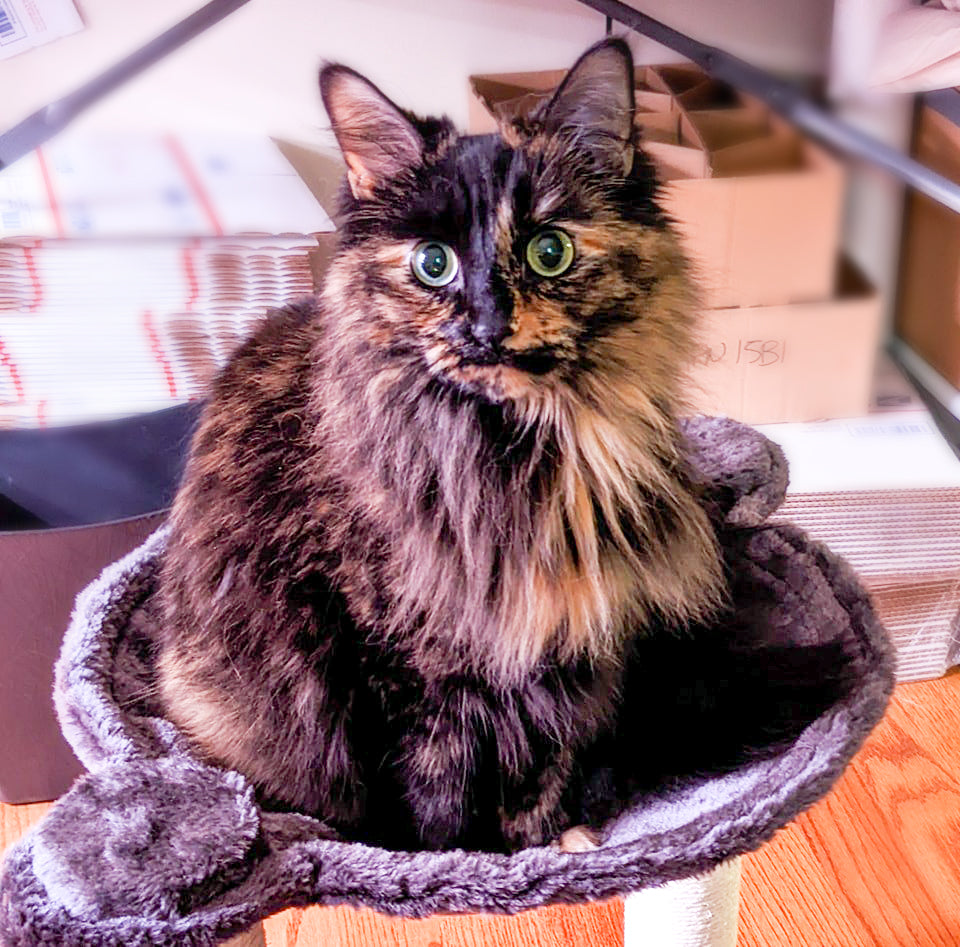 Meow! My name is Olive, and I'm an eccentric but sweet little lady who loves her family and hisses at everybody else. I help keep Amy grounded when times get stressful. I'm always willing to lend a helping paw, or generally just get in the way of everything. I try my best not to get my hair anywhere near your packages, but sorry if you do find one!