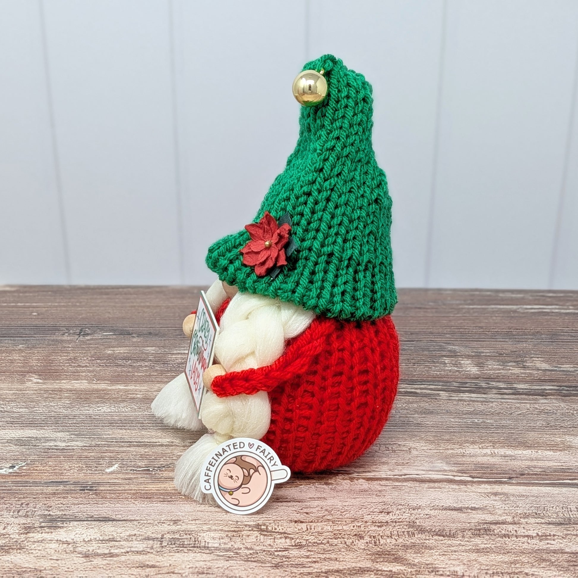 This listing is for 1 gnome. It is wearing a green pointy-ish hat with a gold ornament hanging from the tip, and has a red body and white braids. It features a sign that reads "Crazy Christmas Lady" and is small enough to fit on a work desk, shelf, mantel, or tiered tray. All free-standing gnomes have a non-perishable weight at the bottom to keep them standing upright.
