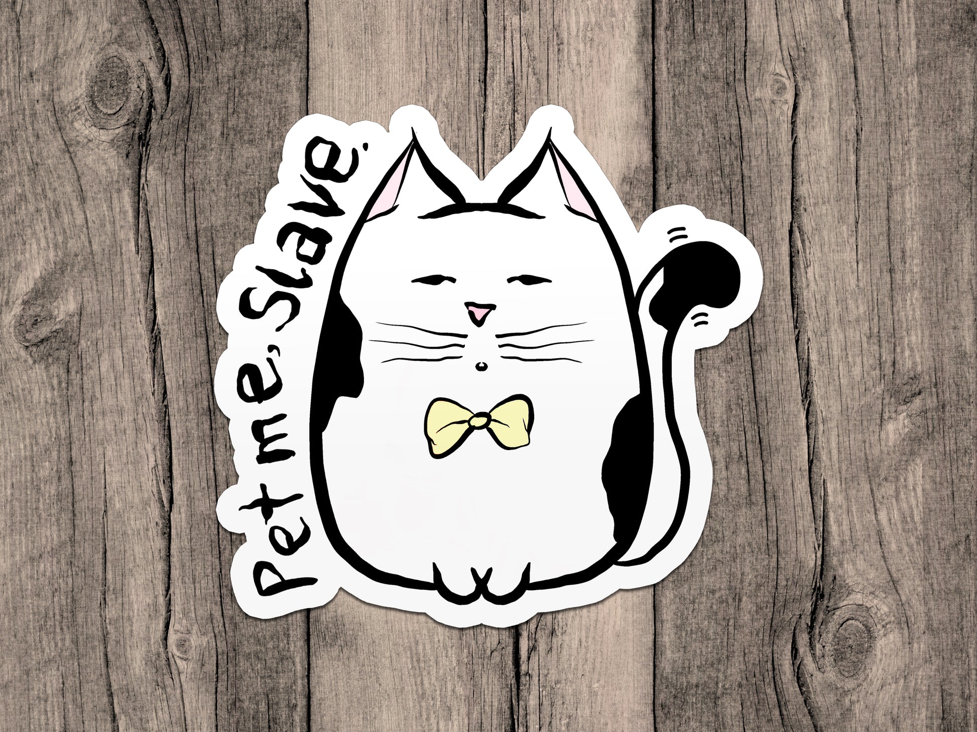 This hand drawn "Pet Me Slave" cat sticker is a must-have accessory for cat lovers. This sticker is a funny way to show off your love for cats and their demanding behavior. It will make a great addition to any cat lover's sticker collection. Grab one for you and a friend today!